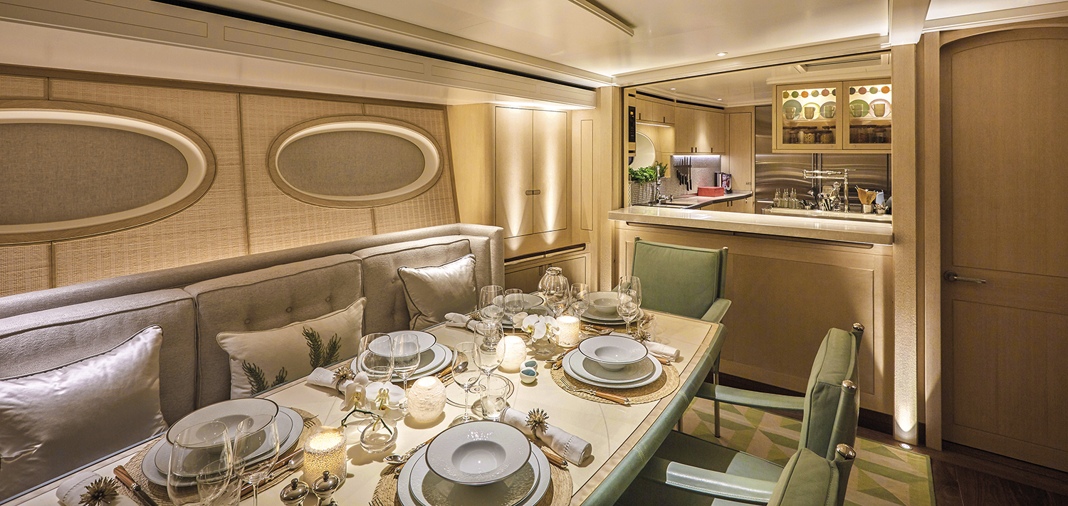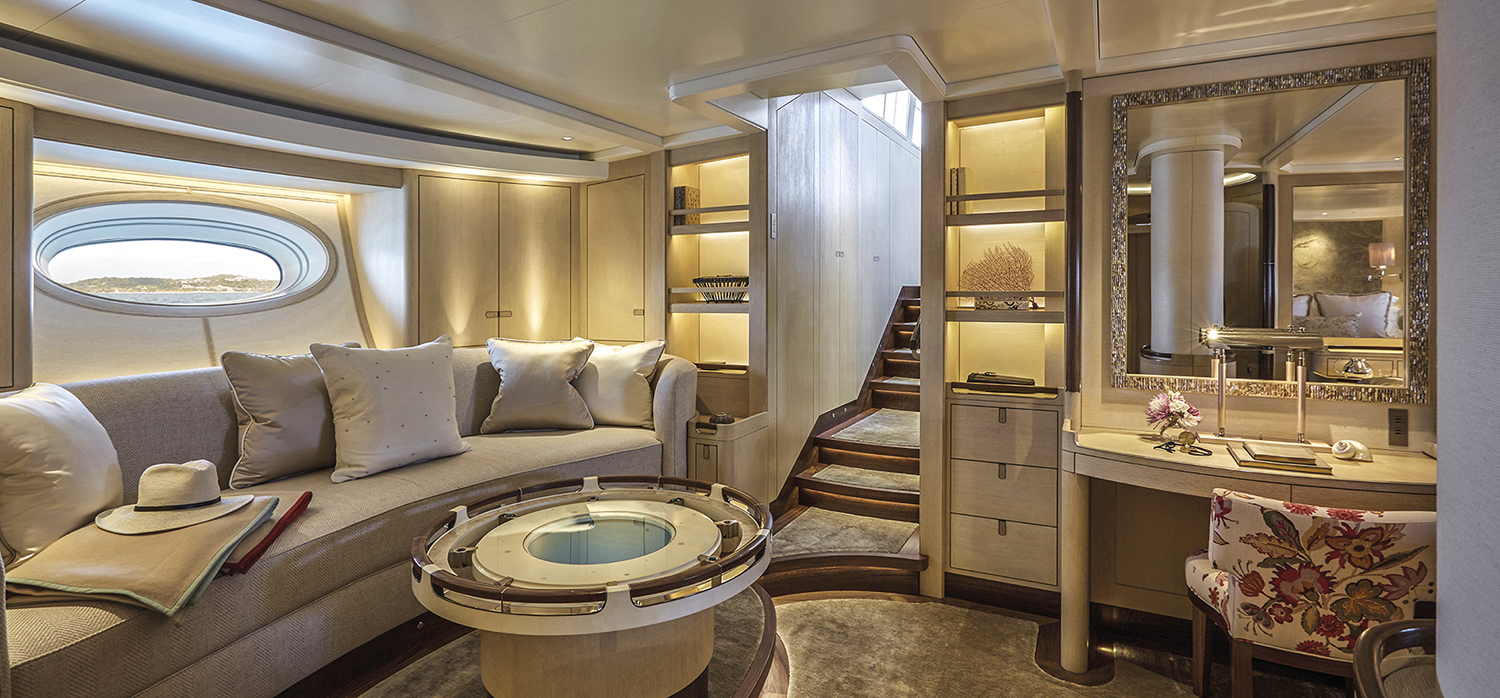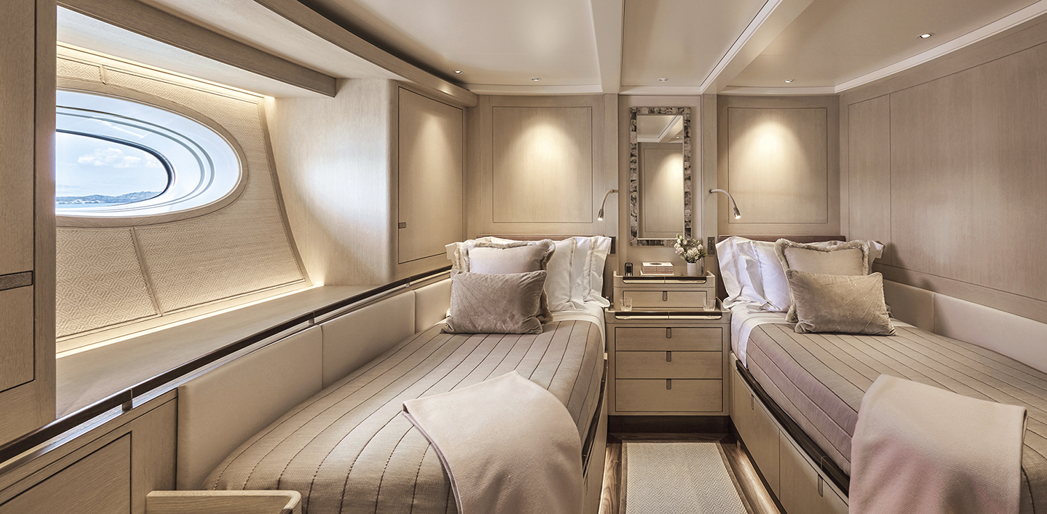 The interior design team at Redman Whiteley Dixon and Pod Interior Style was asked to pay special attention to the aspect of sustainability when choosing materials. The idea was to create an environment with a natural flavour and a dash of tradition. The choice thus fell upon European walnut to be combined with trimmings in pale oak, which has been naturally whitened and then polished with citrus scented wax. The furniture has been enhanced with wood, glass, mother of pearl and leather inserts. A combination of silk, linen, velvet and cashmere was instead used for fabrics throughout the yacht, alternating subtle differences in the weave and structure in each cabin. This look reflects the yacht’s overall style and gives a sense of precision and elegance together with a sense of naturalness.