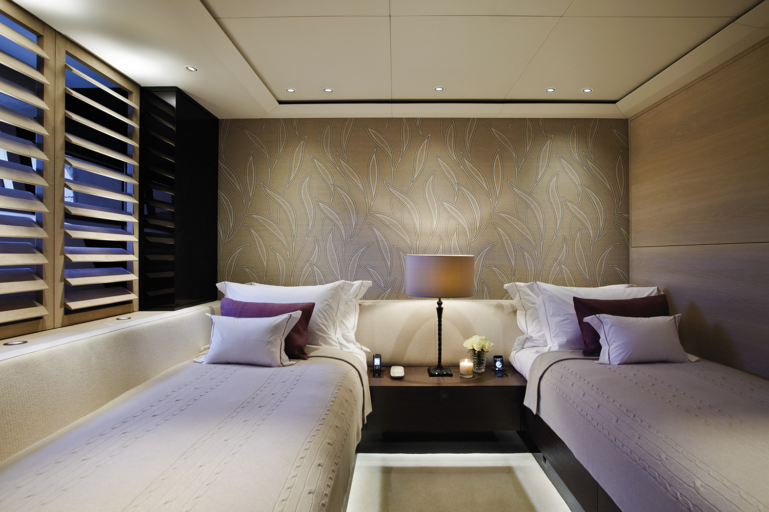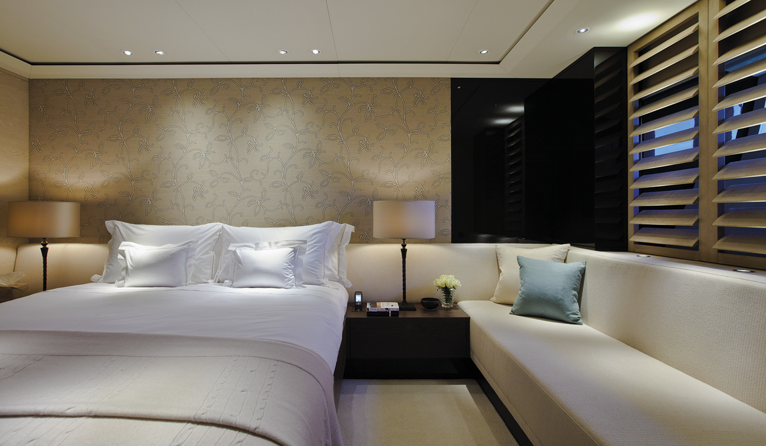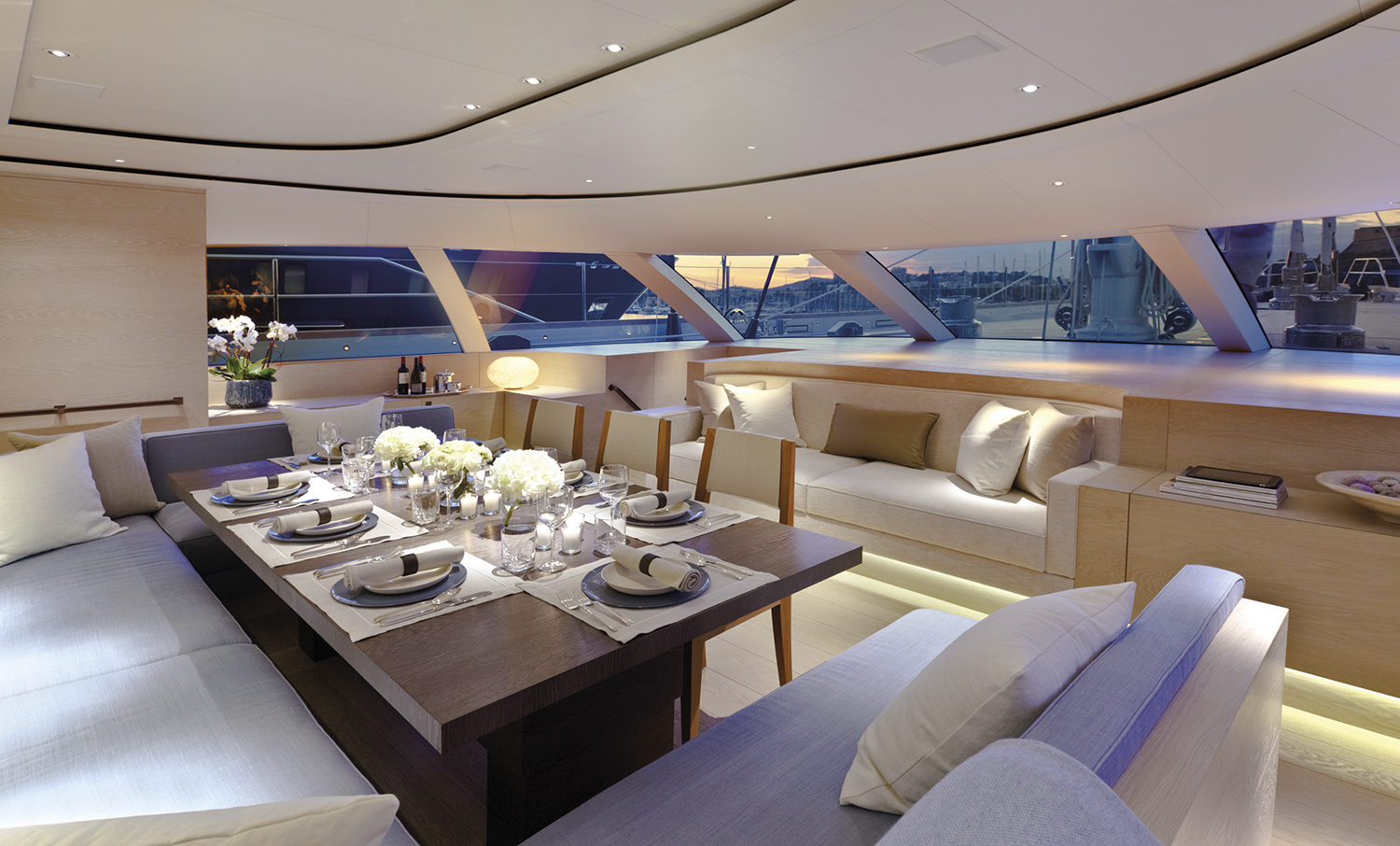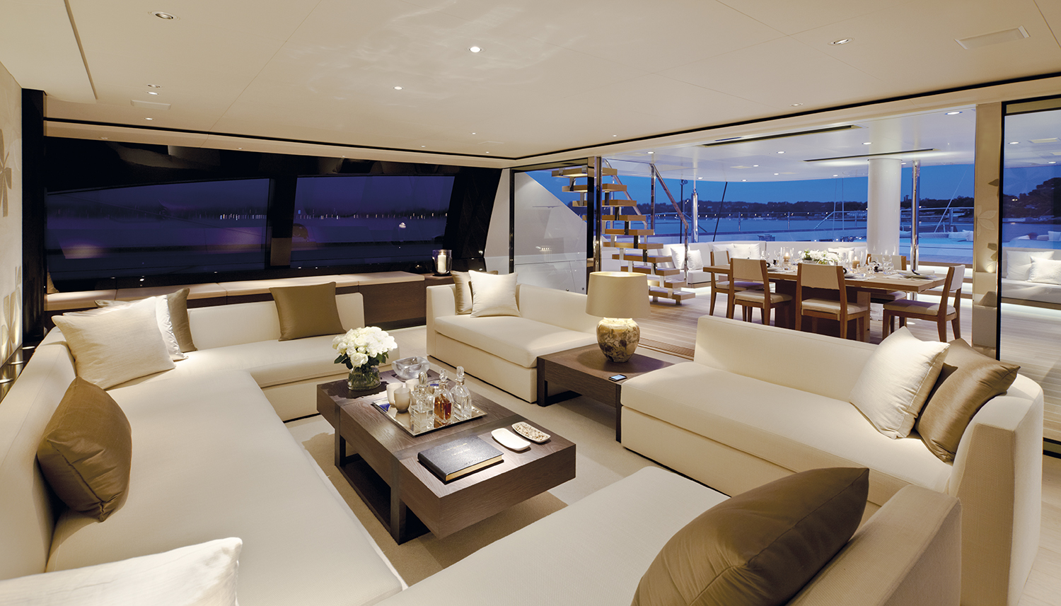 The main deck is for the enjoyment of all guests with a saloon amidships benefitting from the beamy superstructure and natural light from the ample glazed panels. This area well lends itself to view films from and enjoy other multi-media equipment.