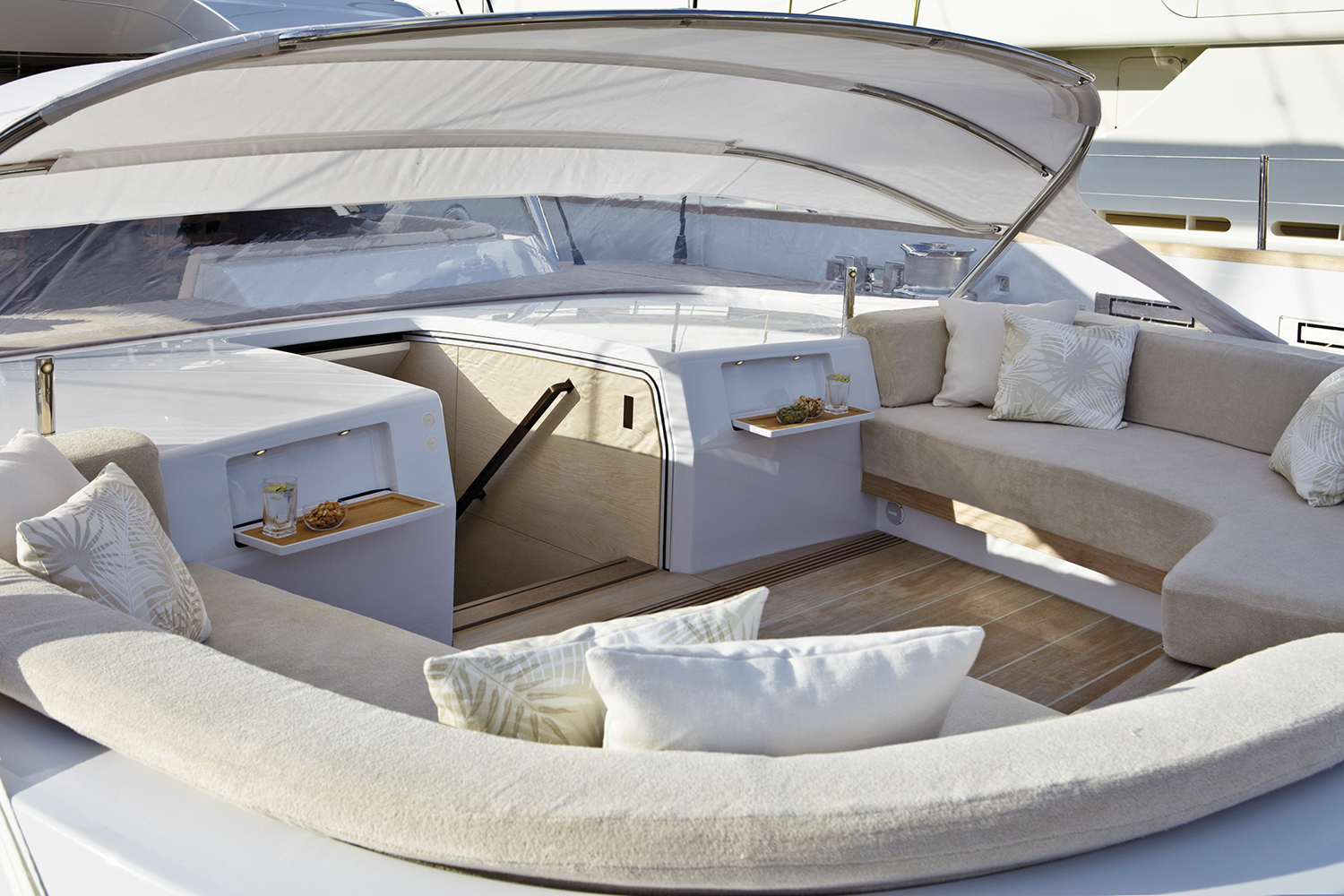 Thanks to ample glazed panelling the interiors are bright and well aired, furthermore the structure hosts a half deck dedicated to the bridge area which has given the interiors additional space for a larger living area inside situated on the intermediate deck between the lower and upper one.