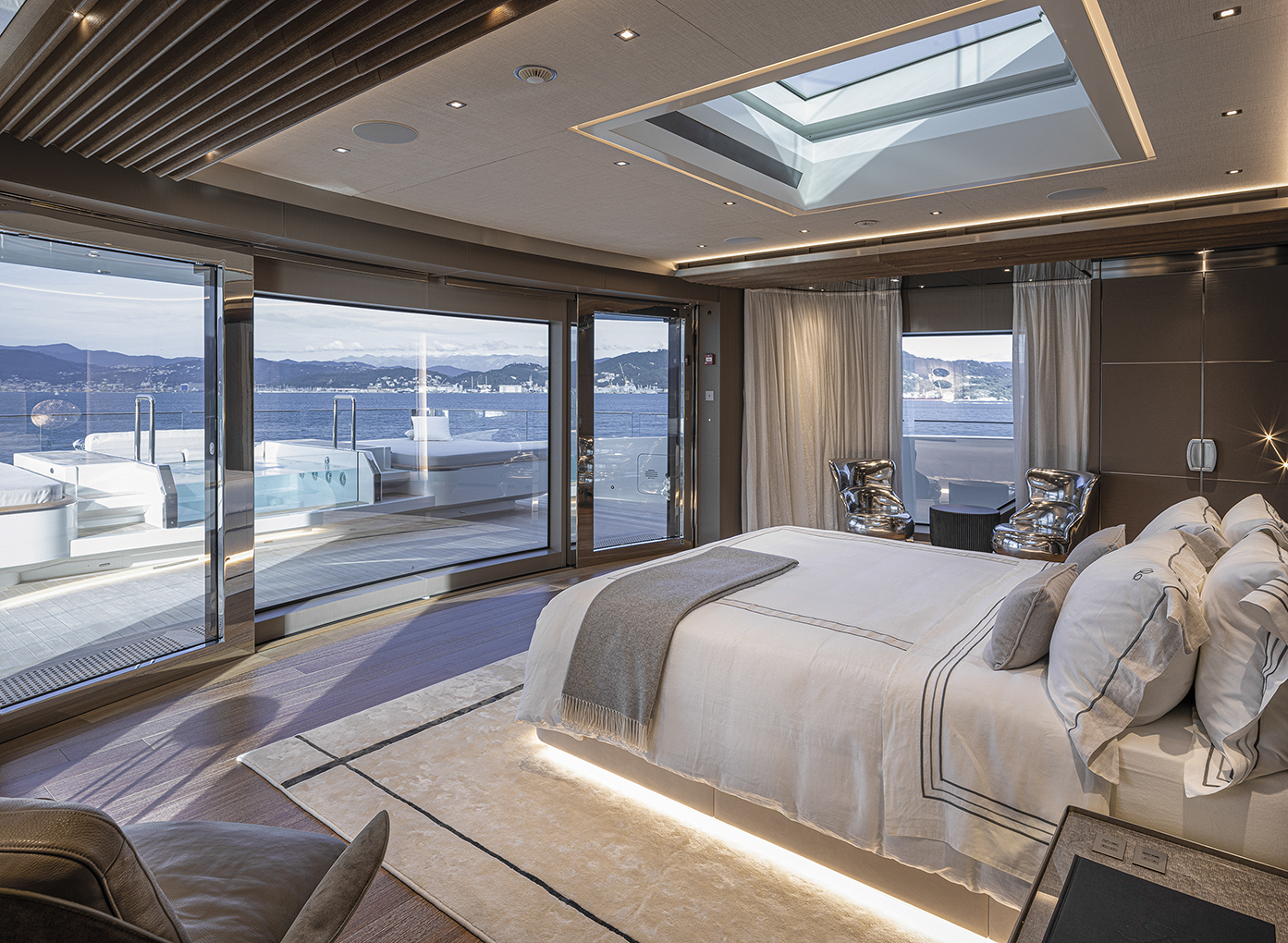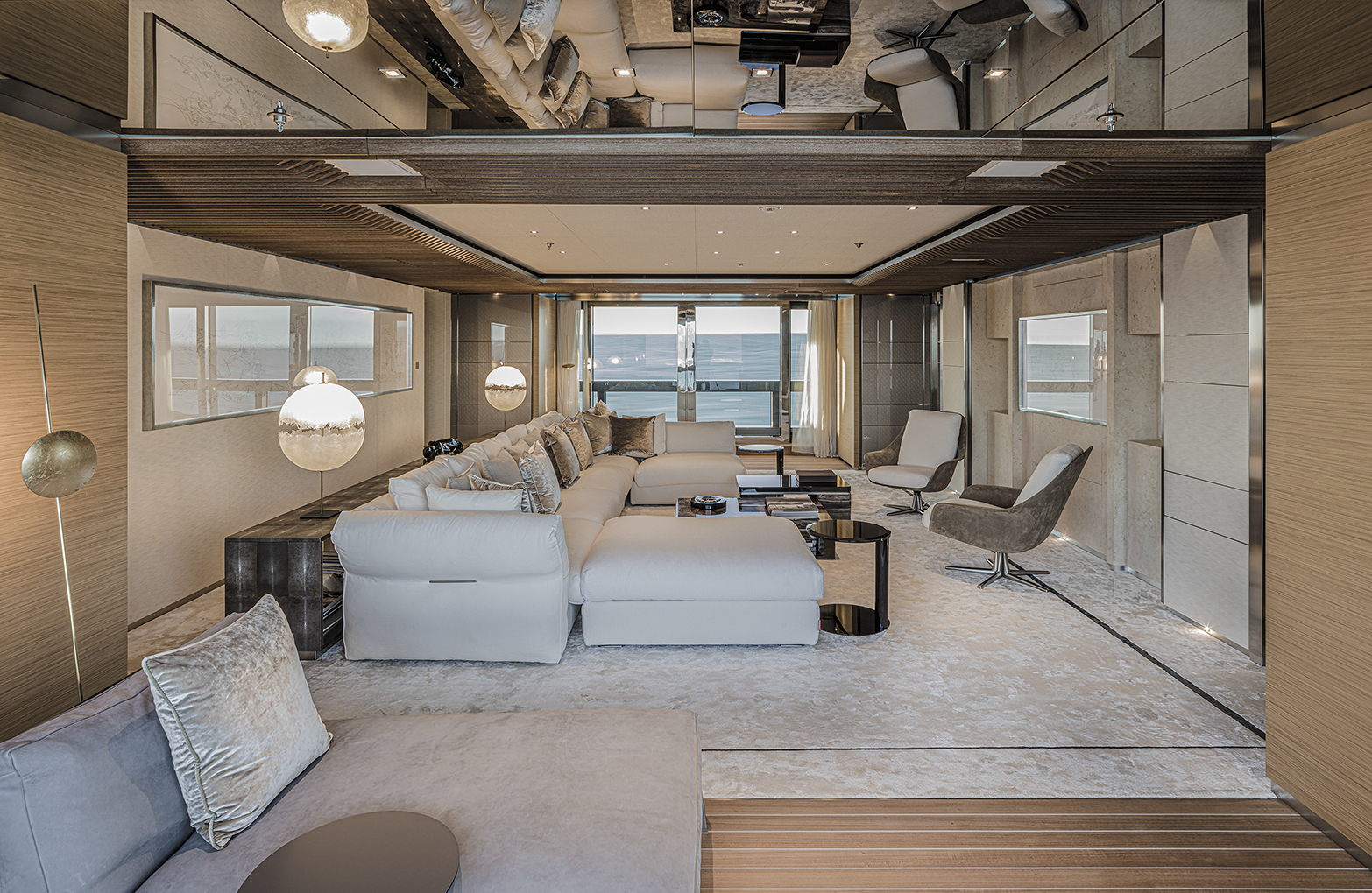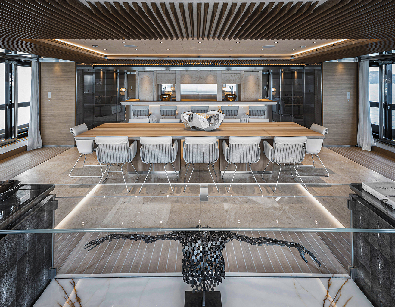 The in house team taking part in the project was Sanlorenzo’s Ufficio Stile with Officina Italiana Design who also worked closely together to deliver continuity between the cockpit’s lounge area aft in the stern with pools, dining areas and beach club situated on the lower deck giving way to an elegant stairway which links both areas as a single communicating one. The beach club comprising the transom and two lateral sides when opened out offer a surface area of 78 square metres in which there’s space enough for a sauna, a hammam, a massage parlour and gym. The cockpit’s dining area has been equipped with an enormous barbecue as requested by the owner as well, a difficult task to accomplish but it was solved by deploying A60 stainless which is fire proof and a ground breaking fumes extractor.