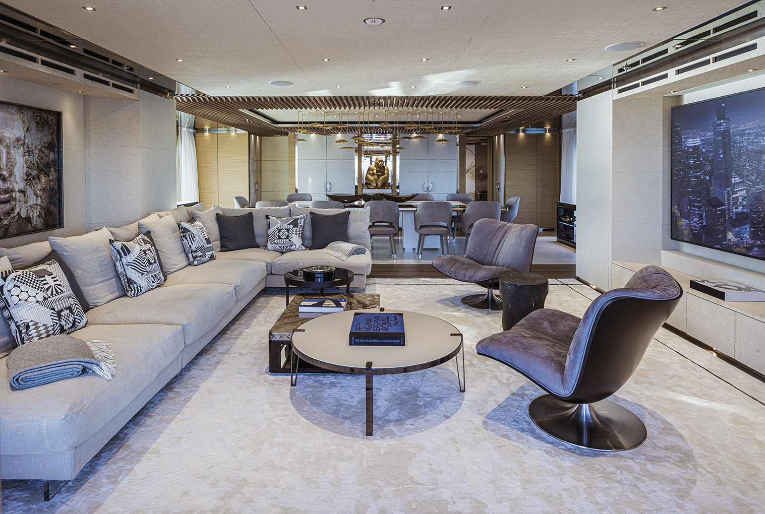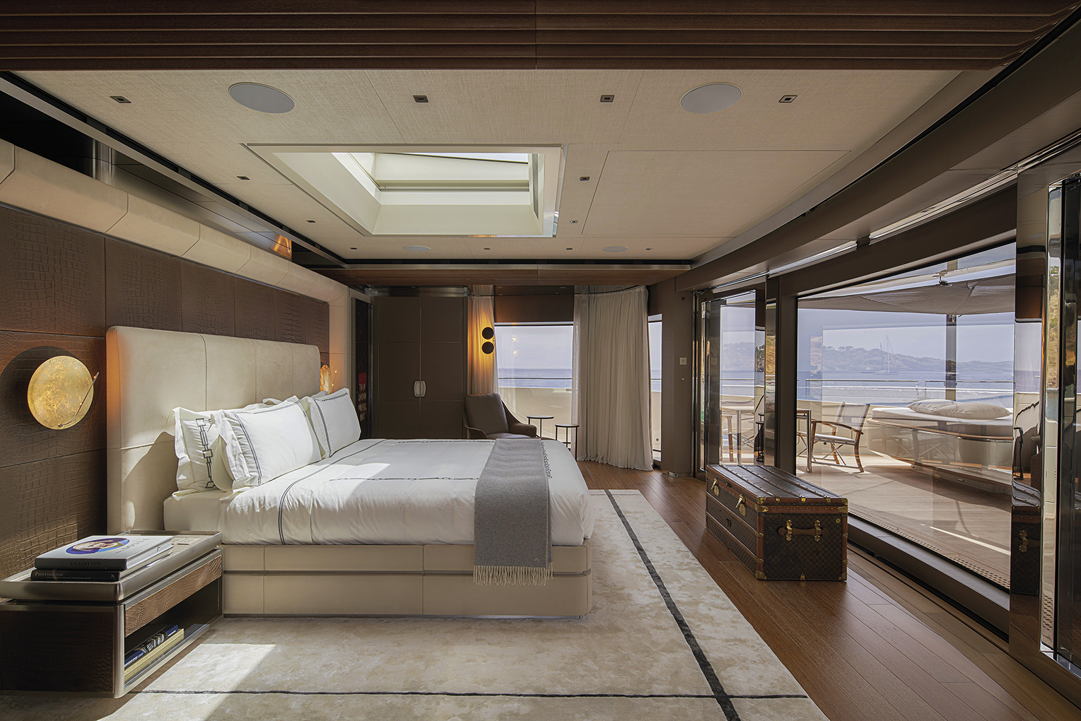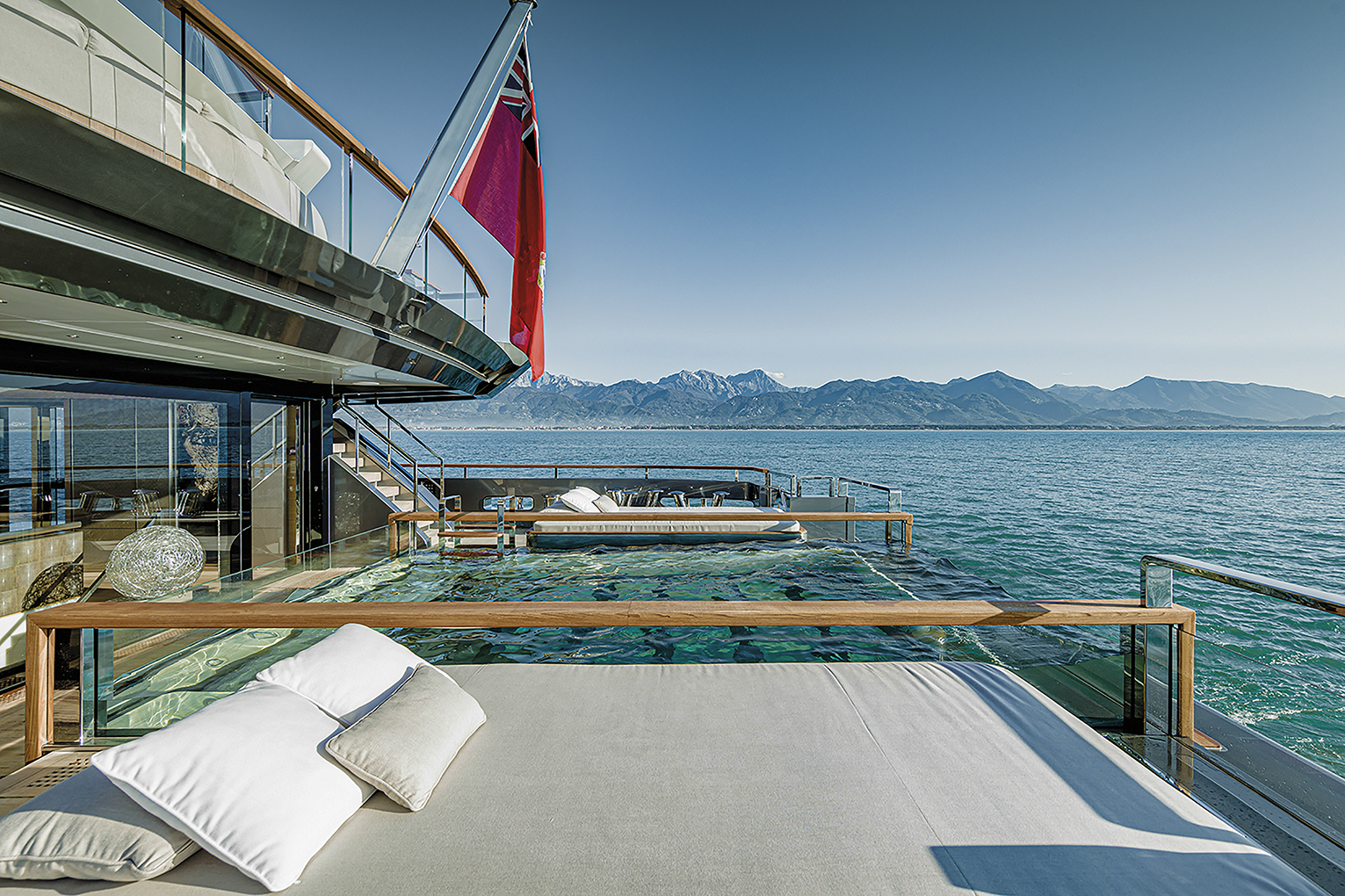 The in house team taking part in the project was Sanlorenzo’s Ufficio Stile with Officina Italiana Design who also worked closely together to deliver continuity between the cockpit’s lounge area aft in the stern with pools, dining areas and beach club situated on the lower deck giving way to an elegant stairway which links both areas as a single communicating one. The beach club comprising the transom and two lateral sides when opened out offer a surface area of 78 square metres in which there’s space enough for a sauna, a hammam, a massage parlour and gym. The cockpit’s dining area has been equipped with an enormous barbecue as requested by the owner as well, a difficult task to accomplish but it was solved by deploying A60 stainless which is fire proof and a ground breaking fumes extractor.