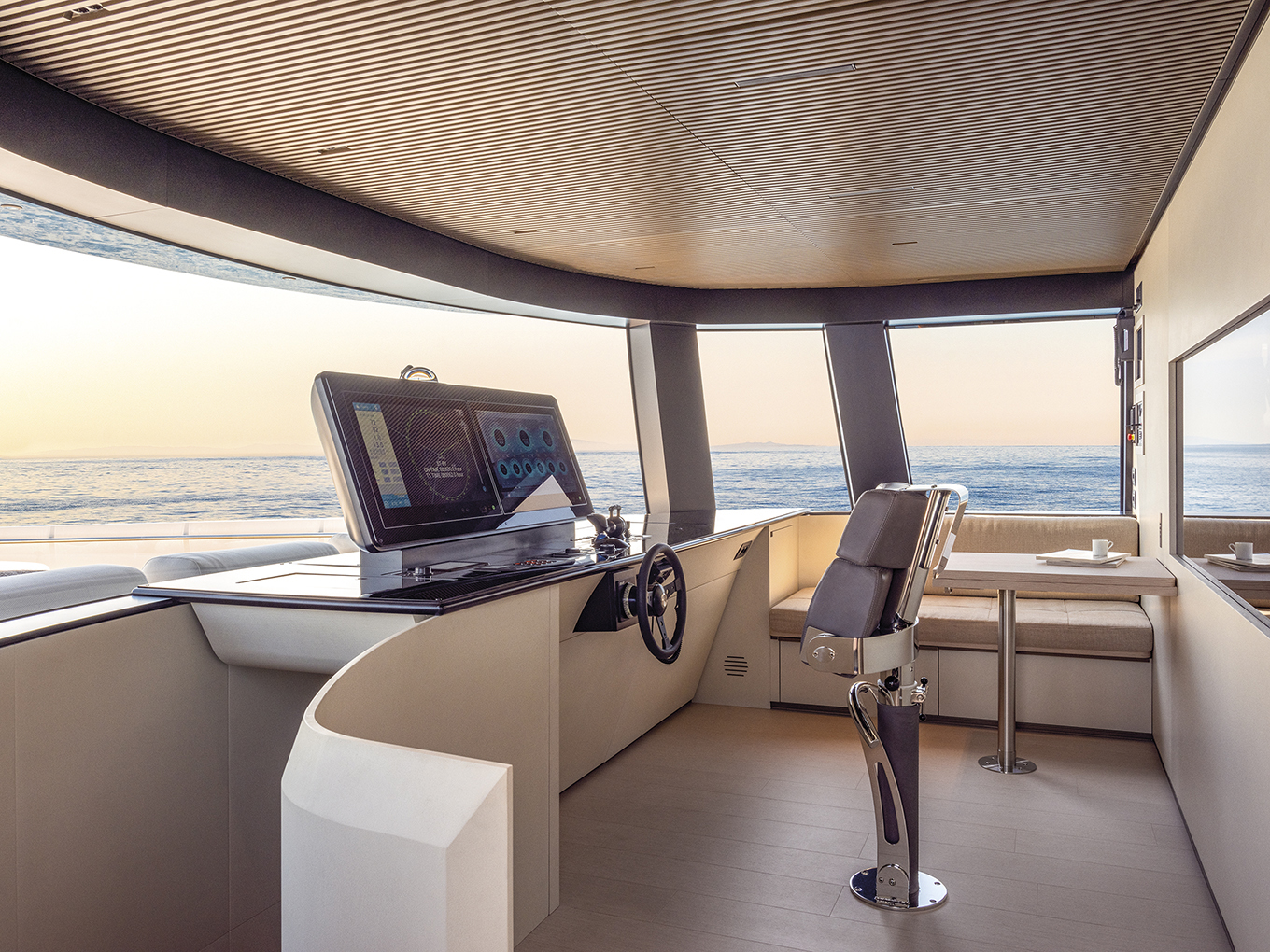 The dining area can be separated from the kitchen, wall on the left, both with a solid or a see-through closure, which open the view on the bridge. Next page, the bridge. Electronics onboard have -apparently- reduced it to two large screens to control everything. The reversed windscreen, Bluegame style, makes the room look much bigger.