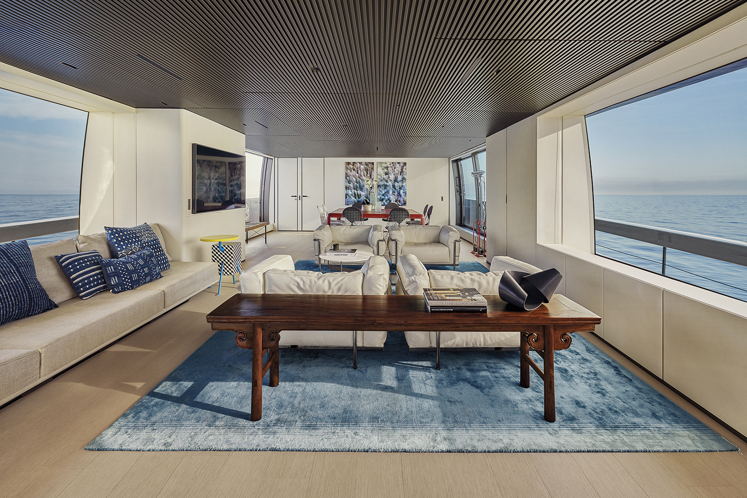 The living area stretches on two different levels, using the lower deck aft area. “A strong relationship between inner and outer space is felt onboard”, says Martina Zuccon, “the fundamental synergy between guests inside and outside was our basis to create a hermetic shell easily opened for space relationships. The terrace descends to water, and all technical information to lower ladder and walkway are hidden, nothing is seen.