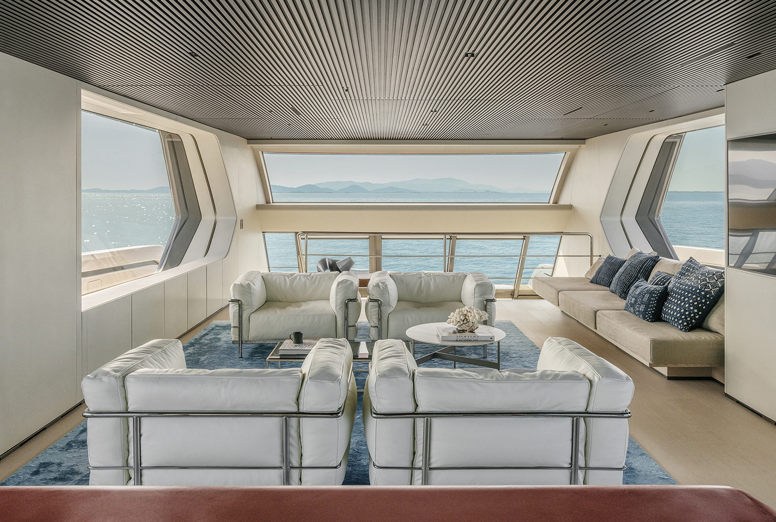 The kitchen is another highlight onboard, on the main deck between the living room and the bridge; it can be closed by thick or translucid walls, the latter allowing to visually reach the bridge through the glass, offering a space widening perspective. The luxury minimalism Piero Lissoni is excellent at creating characterizes furniture, perfectly embracing the project general philosophy. The challenge was to keep a refined elegance without indulging on details, sticking to a substantially essential finishing.