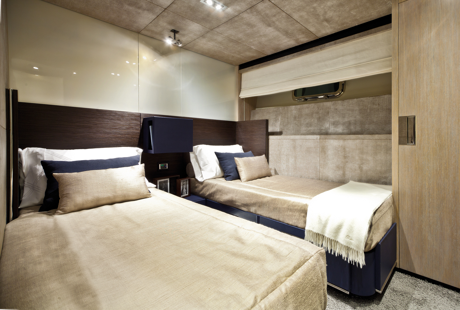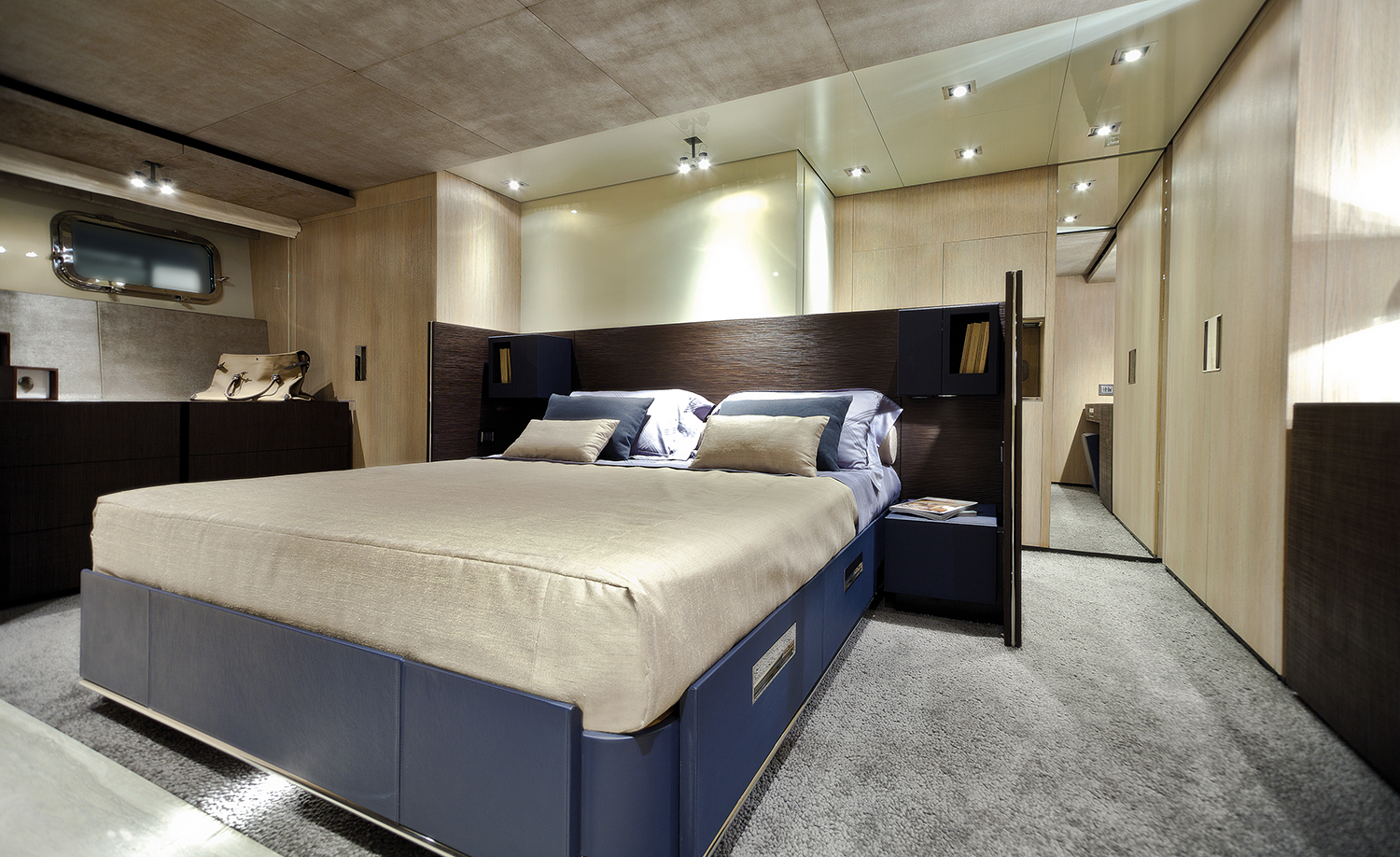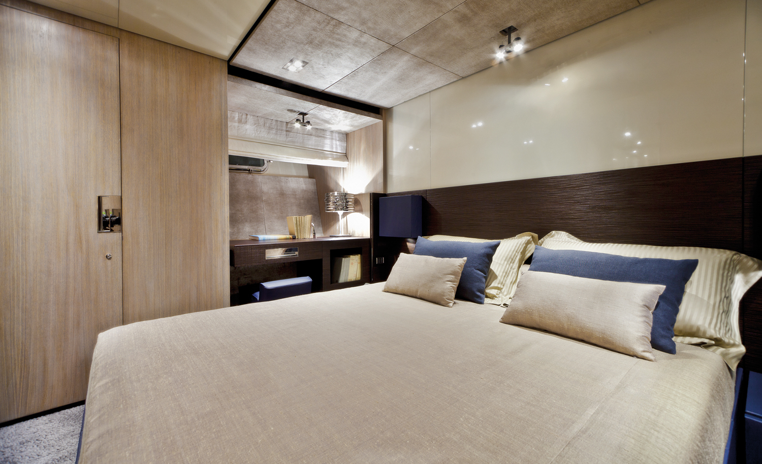 The owner of this first model has chosen to place the night quarters as is traditionally classic with his master stateroom set slightly aft of centre and at full beam, followed by two guest cabins with single beds and forward of which we find a VIP cabin all of which with dedicated bathrooms. The owner’s suite is ‘open space’ and is made up of an office corner, shower cabinet, and in a separate area to convey rightful privacy a bathroom.