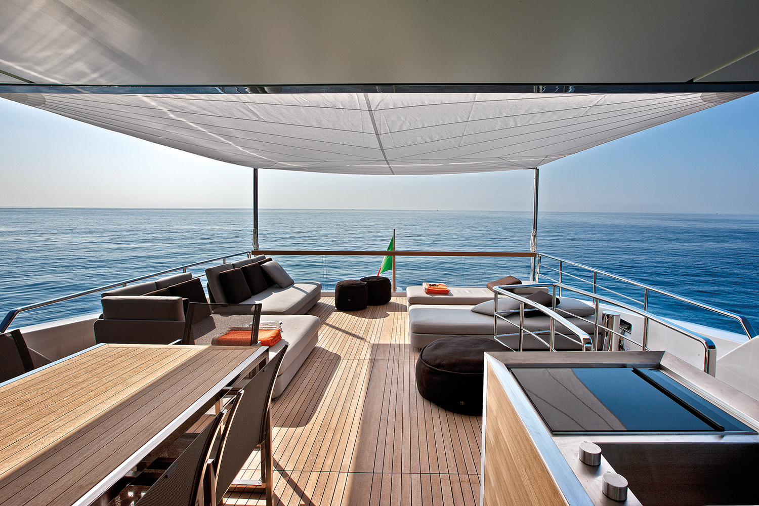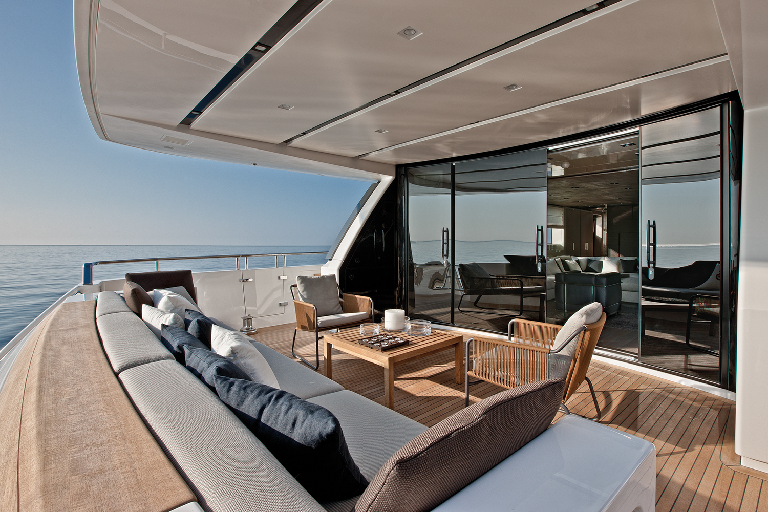 This model sports an opening transom which reveals a large garage area for tender and toys thus leaving more exploitable space to the fly bridge area. Furthermore thanks to the technical staff’s ability the garage in the stern can house a 4.30 metre tender set across by deploying a specially designed recovery and stow system installed therein.