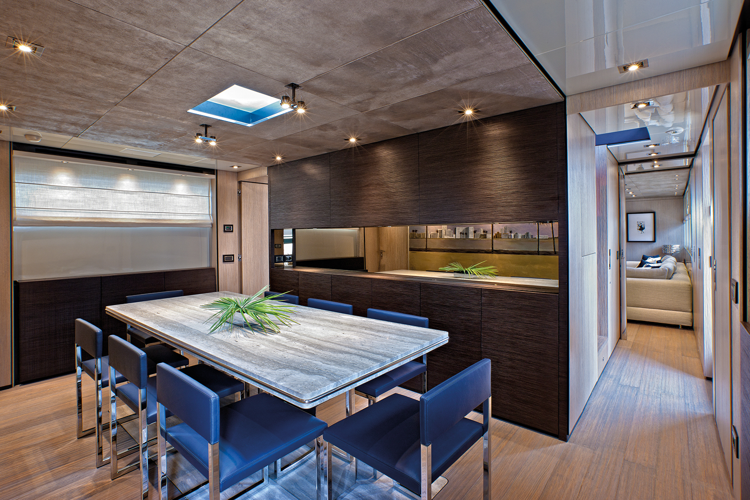 One may perhaps expect more exploitable volumes of space from a 94 footer motor yacht, but the choice of an opening garage in the stern transom offers considerable advantages to be enjoyed up on the fly bridge, which in summer is surely more exploited than inside, and also makes launching and recovery less invasive for guests. This is a choice we wish to share and approve of if seen from the point of view of the yacht being used mainly during the summer season.