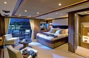 An interesting performance, but without forgetting we’re looking at a 40 metre superyacht from which we expect qualitative comfort and we’re not disappointed on this score either. The 40 metre Sunseeker is a semi custom built yacht which can be personalised in both the choice of materials and fabrics, and layout with several solutions available specially regarding the owner’s suite which extends for the full beam of the wide bow area on the main deck and is comprehensive of a walk in wardrobe, a lounge corner and a generously sized bathroom en suite. The owner may of course opt for something less than a king size bed or for a little more room which could be “stolen” from the galley which is situated just aft of the owner’s suite next to a landing leading to stairs connecting to the other decks. The remaining portion of the main deck is taken up by a dining room, and living room which in this case boasts different dark shades of fabrics and features welcoming sober styling. A bar corner and cabinet is situated aft of the living room so as to serve drinks up to the “al fresco” lounge area as well. The lower bridge houses the guest quarters which are made up of two VIP suites and two with twin beds all with dedicated bathroom. The crew’s quarters are in the bow end of the same deck and are accessed through a separate entrance. The captain’s cabin is placed on the upper deck in the bow area just aft of the modern and technologic command/controls station.