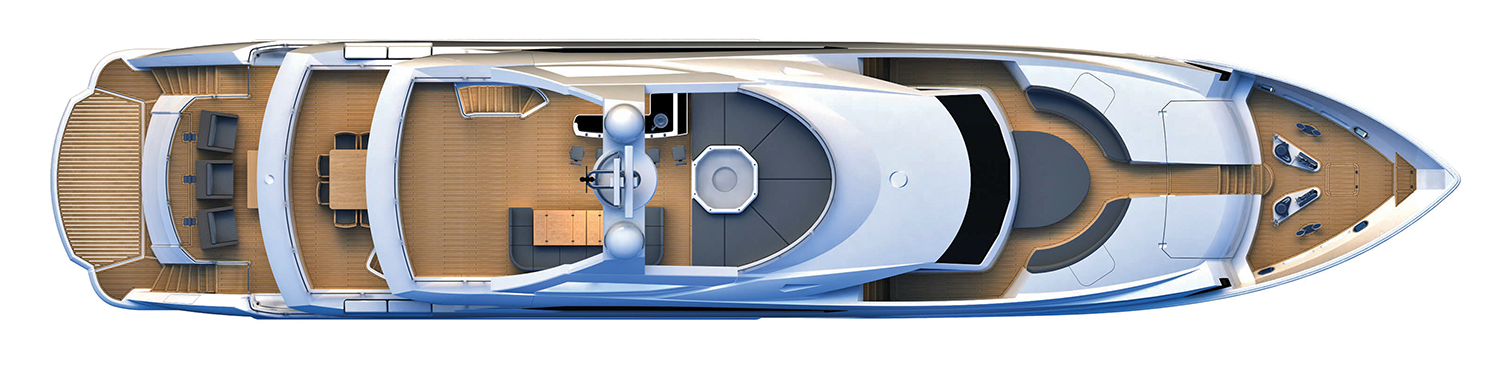 The layout here foresees an alternating arrangement of open and covered spaces where the superstructure houses a lounge area with corner bar and a dining area along the stern extension with a suggestive ocean view. Tan fans will certainly appreciate the top sky deck which is equipped with sun pads, a lounge area, and an inevitable circular shaped Jacuzzi tub.