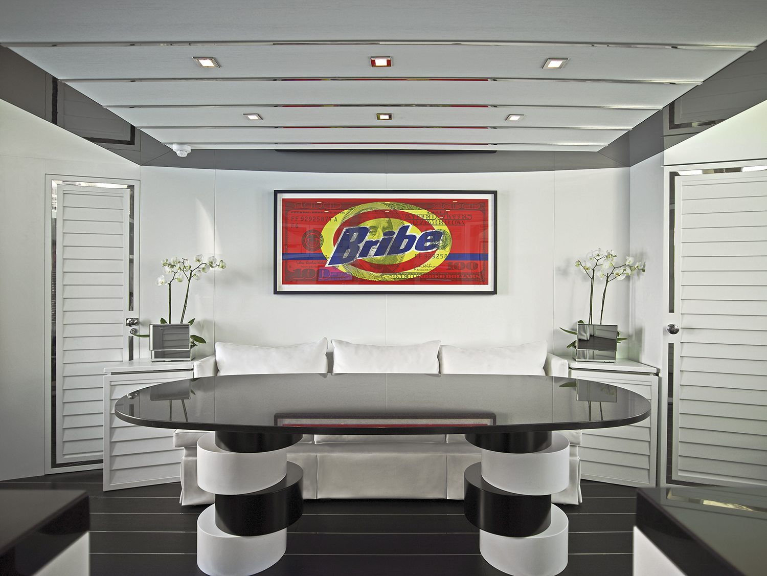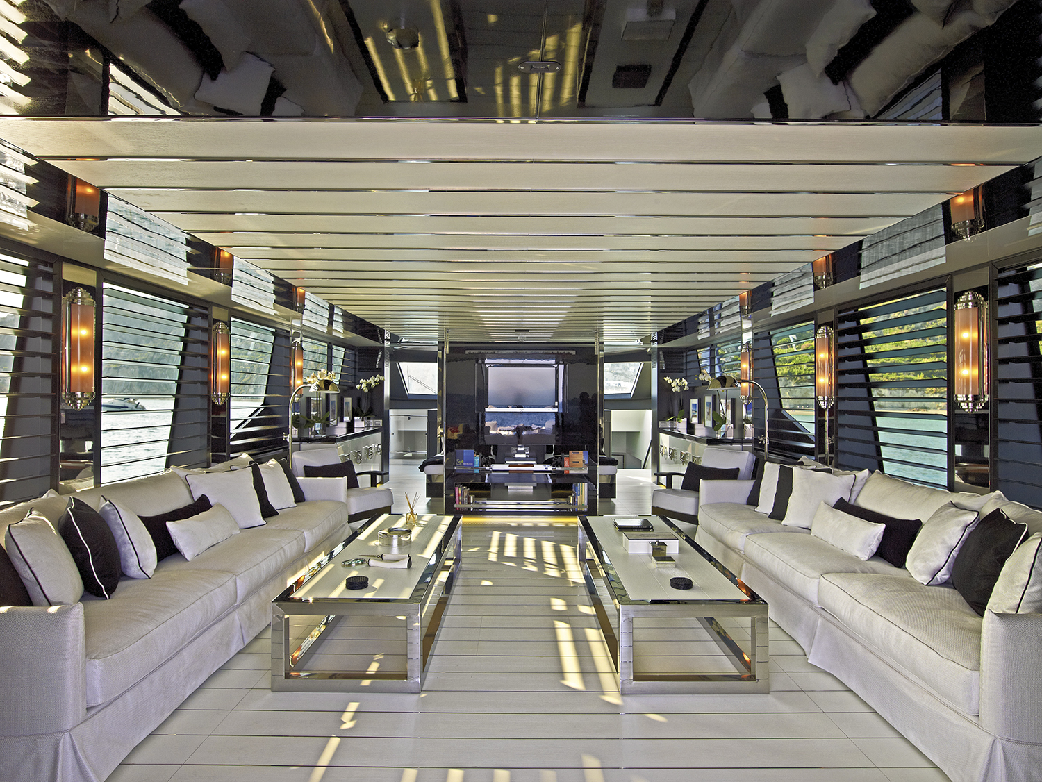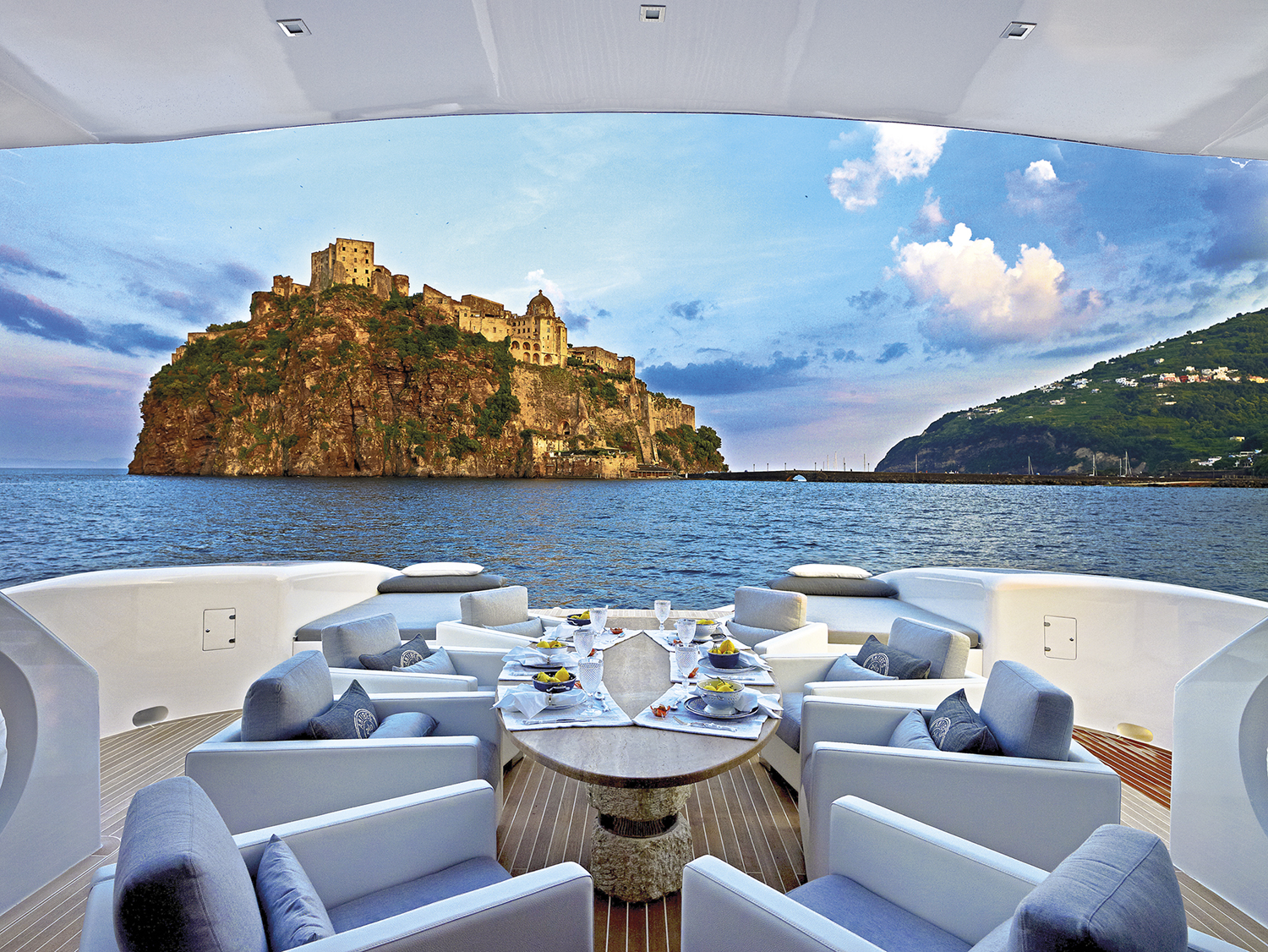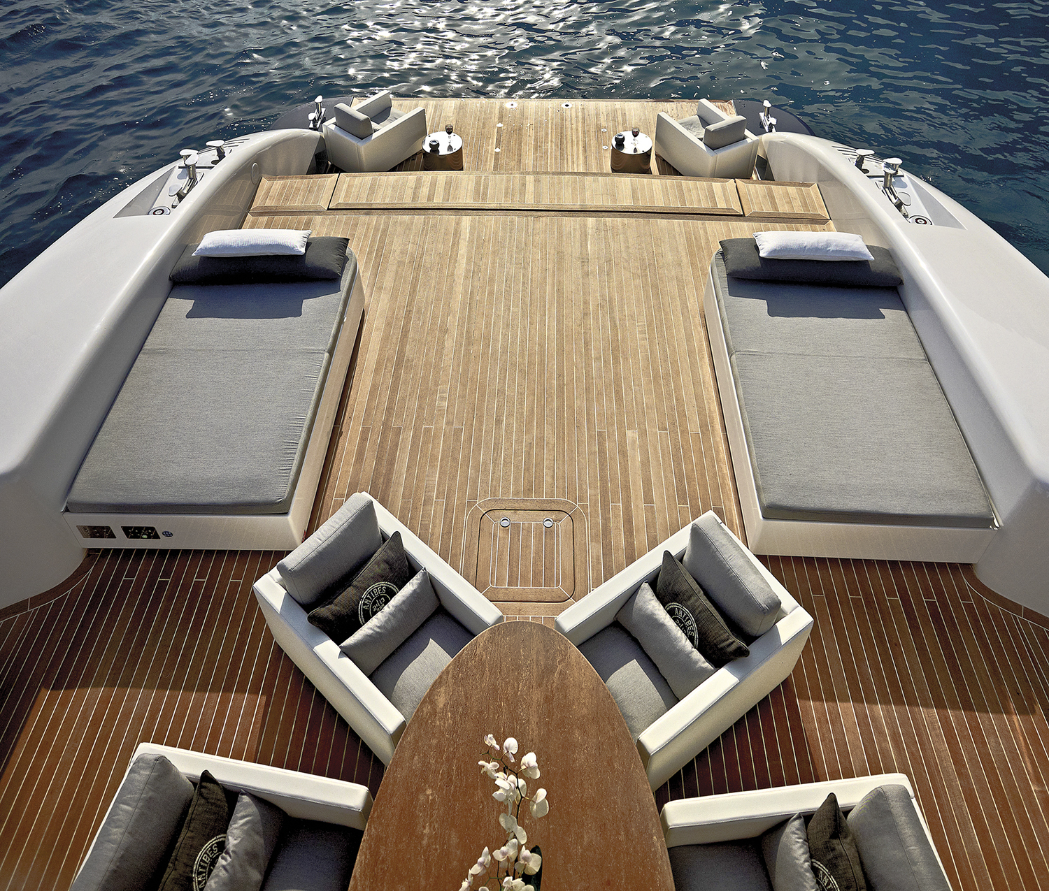 Today’s Tecnomar is certainly looking towards a more international market by having taken part in several international boat shows namely the ones in Abu Dhabi, Shanghai and Beirut with 12 new attractive projects which include sailboats and that are aimed at a wide ranging clientèle without forgetting the past, what came before and how and what brought the yard to the present times. Certainly there will be a Grp. motorboat line made up of seven boats, which continues and will continue to be of great interest for its evolving technical and design contents as already seen in the most recently launched models. The superyacht we’re presenting here, originally derives from what was called Velvet 35, designed by Luca Dini, the in house design team Centro Stile and designer Ioanna Marinopoulos called in by the owner to develop the interiors of his boat as well have installed a number of innovative solutions to enhance comfort, greater views and conviviality. The bulwark opposite the saloon has been lowered on each side so as to increase sea view from within but also to make the saloon brighter still with added natural light. The lateral glazed panelling has been modified to become a single larger spread which creates a pleasant contrast with the white superstructure making it lighter still. The bow too sports a number of significant changes in layout: a circular dining area which can double as a sun soaking one for tan fans with a lounge corner as an alternative to the cockpit has replaced the classic sunbathing zone. The lounge corner offers added privacy when tied up stern to. Still on the subject of the external layout, today’s Velvet 36 boasts a more than accentuated flying bridge which is firmly installed into the structure along the coachroof top on which there’s not only room for a large tender (which can also fit into the appropriate stern hangar)but also for another open air L shaped lounge area.