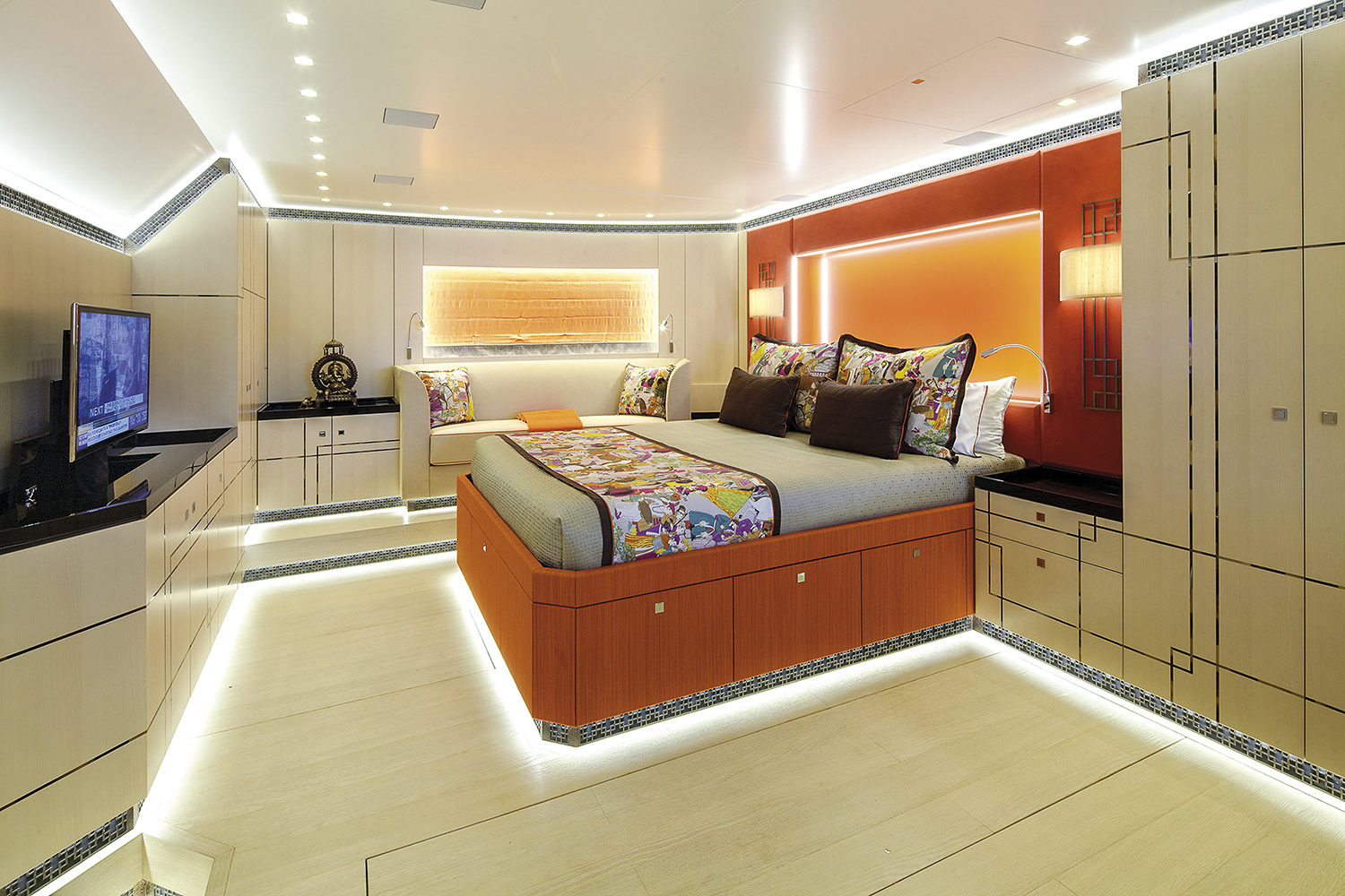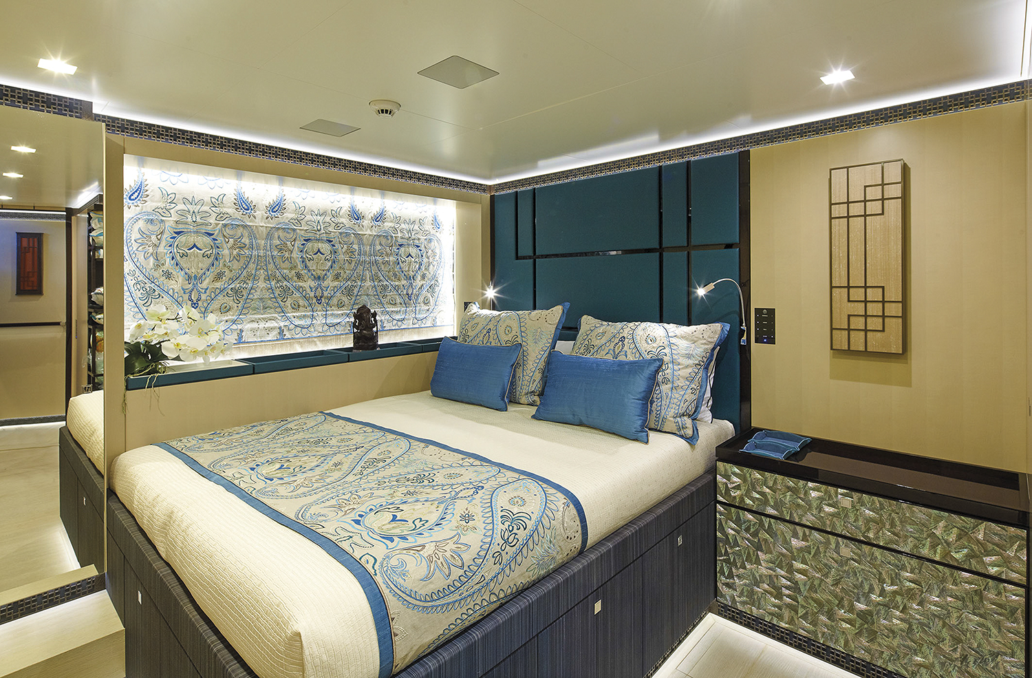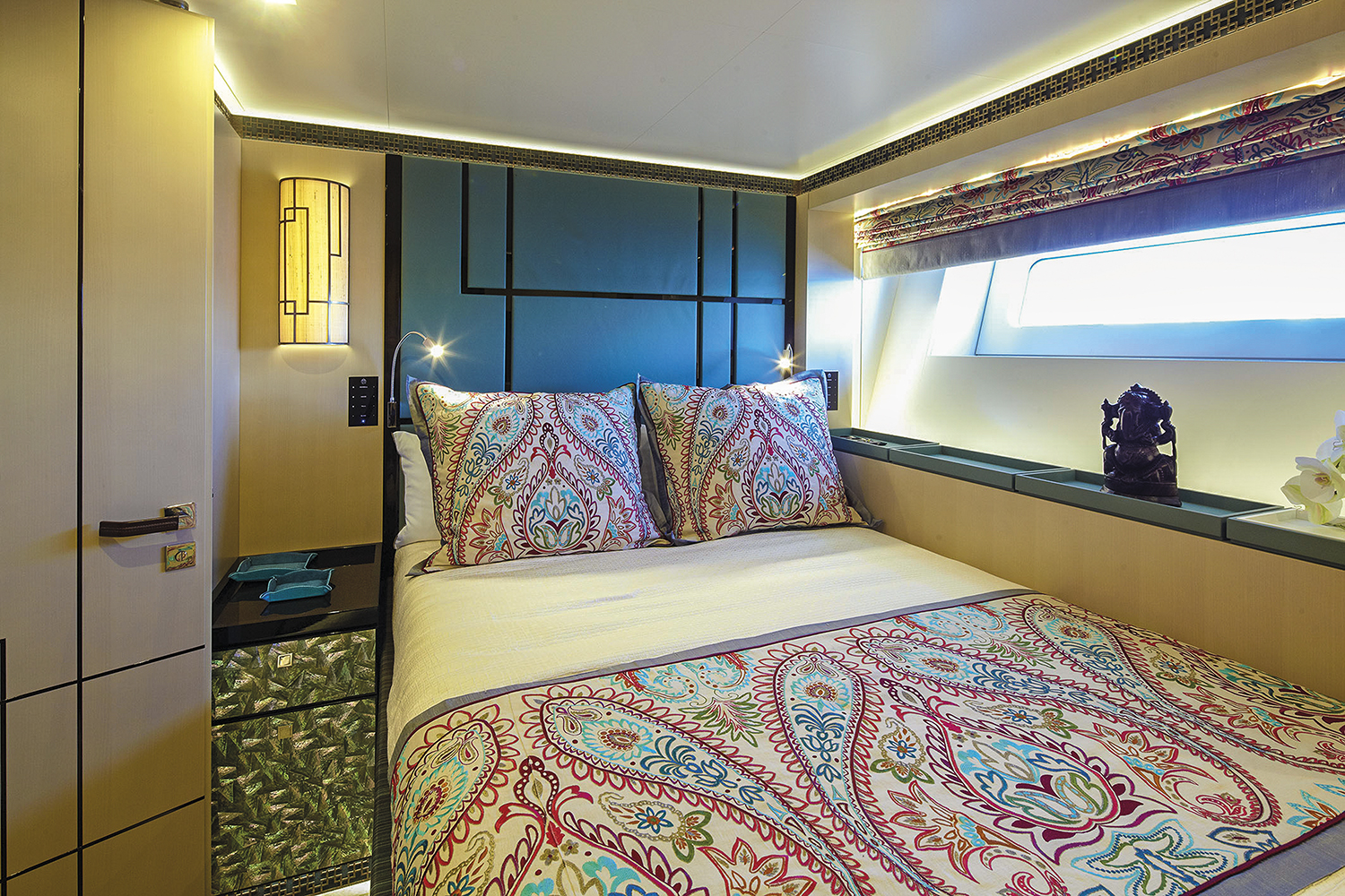 Katharina Raczek interior designer well interpreted the deity after whom the yacht is named and also represents perfect balance between masculine and feminine energy in other words between strength and sweetness. She’s created bright and modern interiors dotted with continuous reminders of the culture which inspired her. Little statues stand out in the cabins, but above all some of the furniture is faced with patterns recalling elephant skin – animal which normally represents Ganesh.