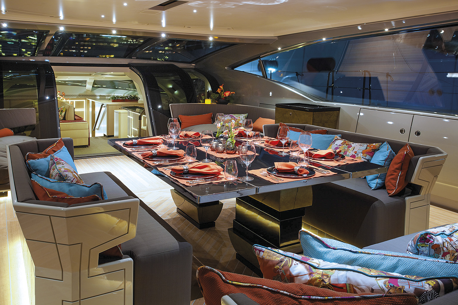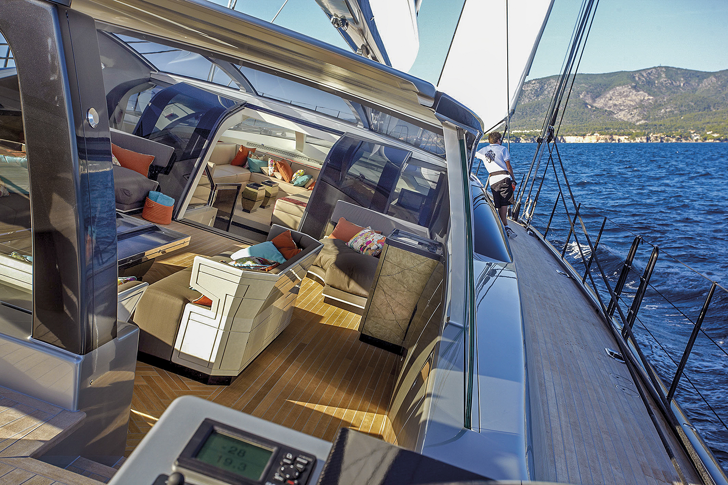 On deck there’s a wonderful carbon Bimini top which in absence of a fly-bridge ensures sporty elegance while delivering plenty of shade over the cockpit area furnished with three large sofas and dining table. This area can also be closed off with glazed panelling at the push of a button.