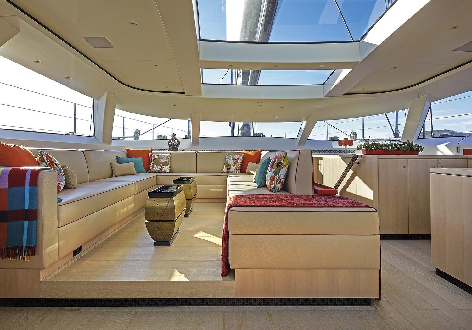 This option is certainly a versatile one which can be deployed anytime in any climate and circumstance thanks to an efficient air circulation system which can always keep temperatures cool. When sailing the tropics in warmer climes, the coachroof and coaming can open out to form an unexpected open plan lounge with the stern deck. A mock-up was specially built at the yard to fine tune the whole of the exterior layout and every detail therein. Glazed and tinted ports not only light up the interiors with plenty of natural light but convey to the whole area fluid harmonious structural lines.