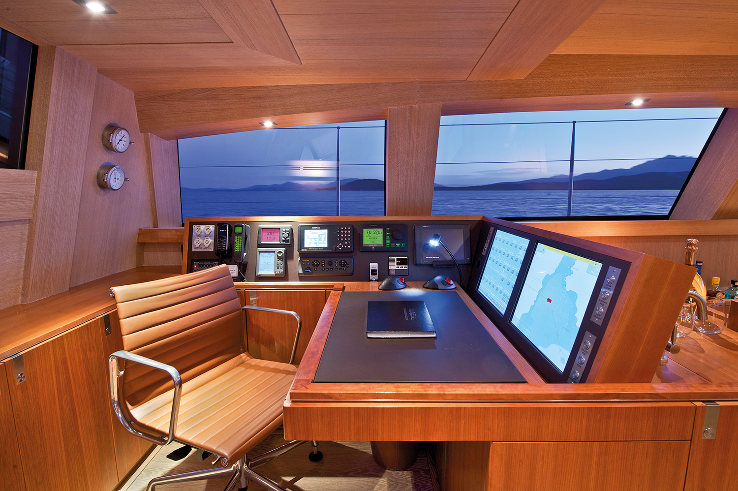 The upper central area amidships from inside offers a great sea view with another saloon furnished with sofas, table, multi-media gear opposite to a bar corner astern of which we come to the helm controls inside the wheel house.