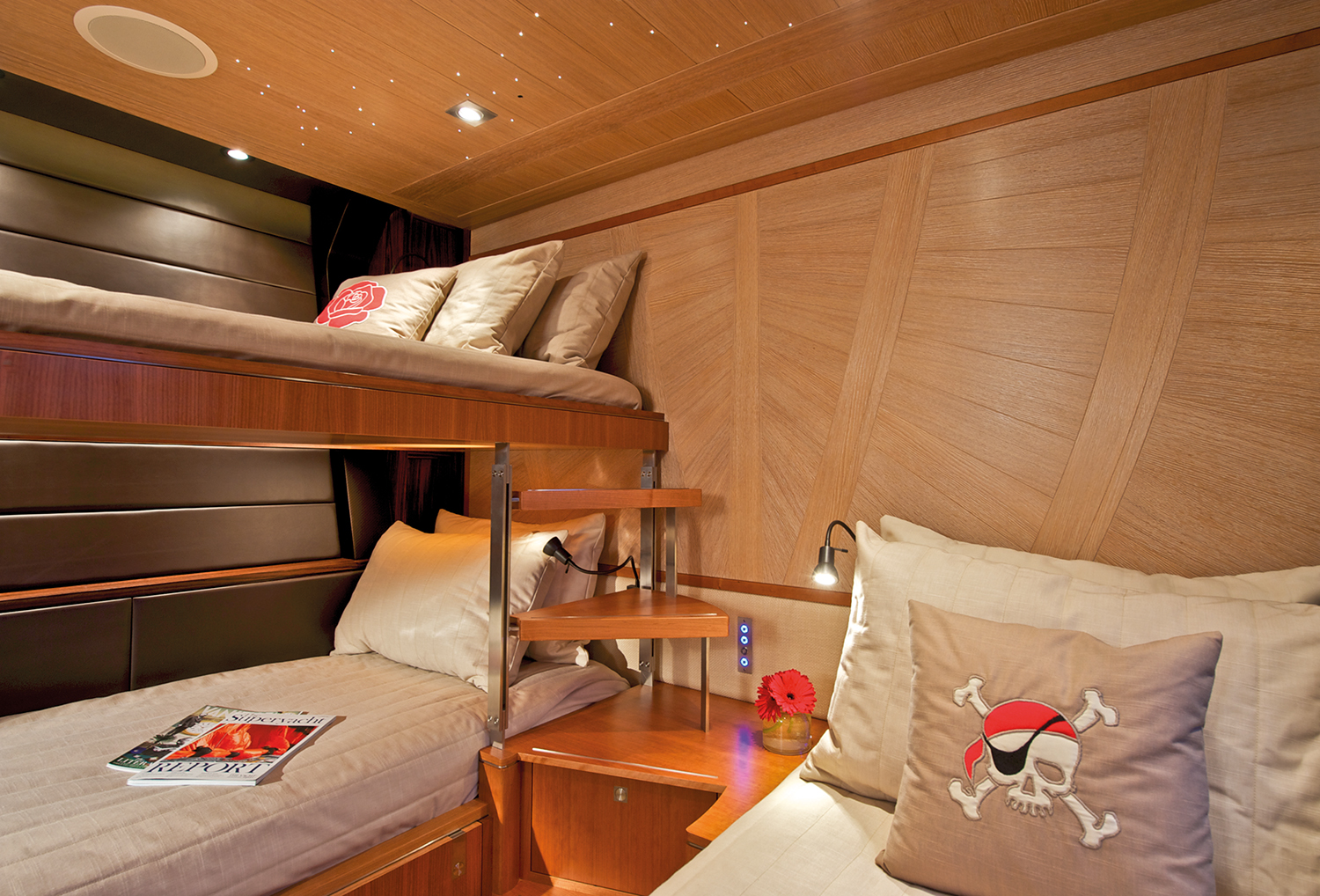 The port side hosts two cabins one with twin beds for the children, and a communicating bathroom is shared with the nanny’s cabin alongside. On the starboard side there’s a double guest cabin with dedicated bathroom.