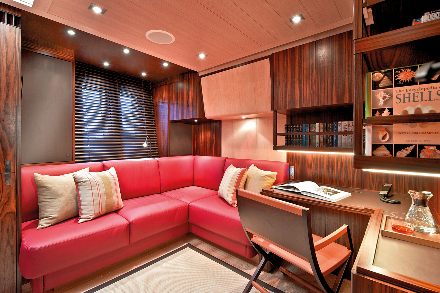 The engine room, ship’s plants and technical area are situated amidships while the bow area sports a large study which doubles as a further guest cabin with dedicated bathroom, a saloon, galley and adjoining dining area forward of which there’s a crew mess room, laundry room, captain’s double cabin and private bathroom, as well as two crew cabins with bunk beds and dedicated bathrooms.