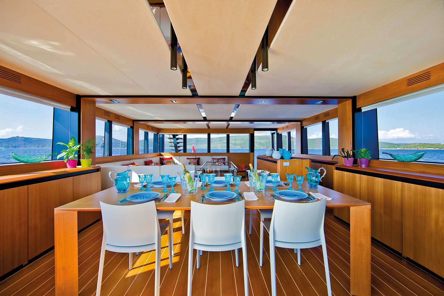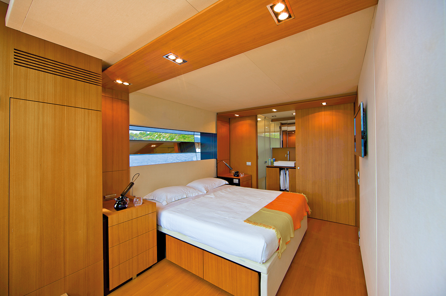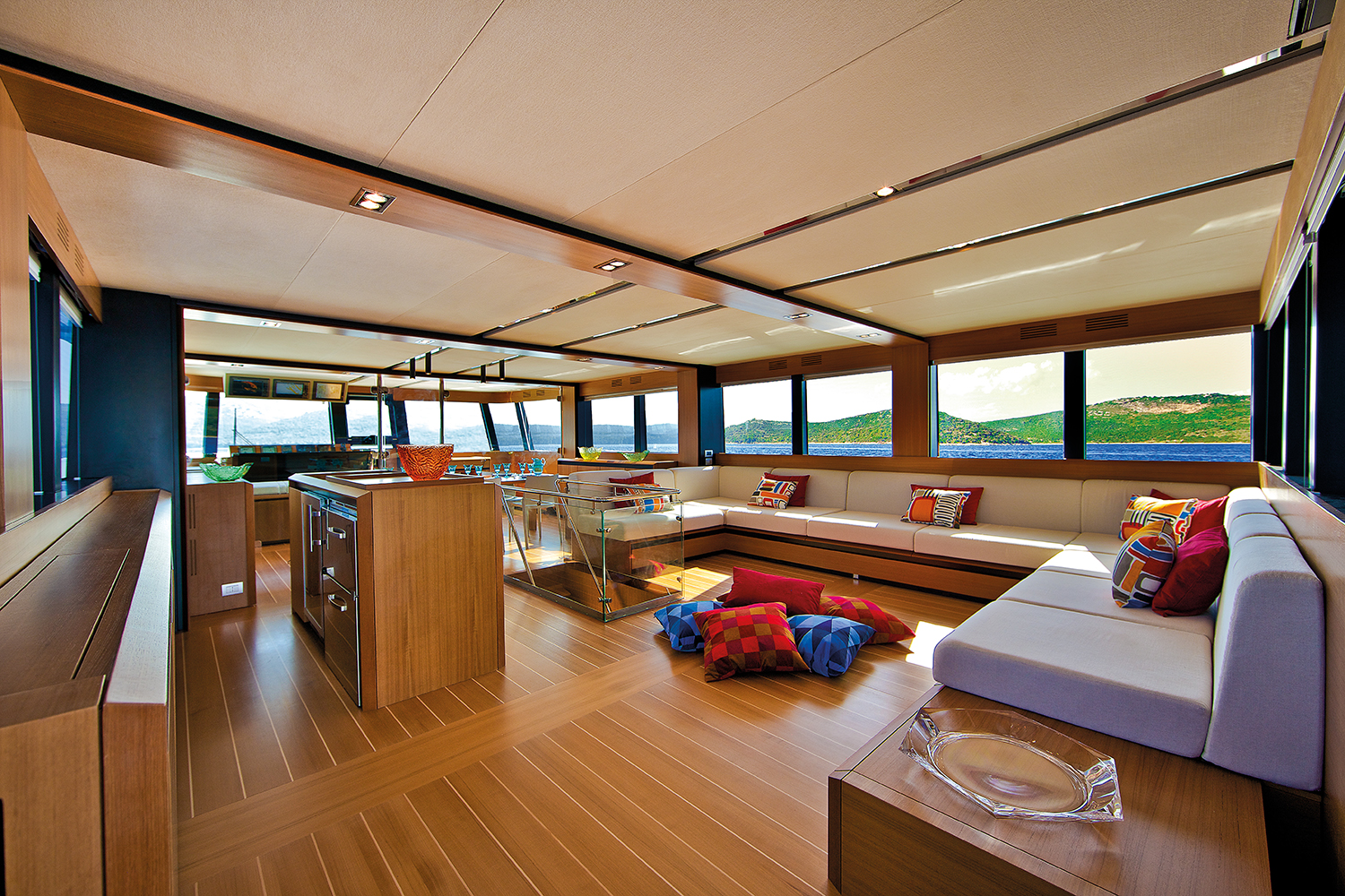 The beauty of this astounding solution means that the cabins astern are flush with the beach platform and just a hair’s width away from  surrounding waters. A fascinating idea when underway (and don’t even think about speeds of 30 knots, exhaust fumes and noise) and more so when at anchor in a bay.