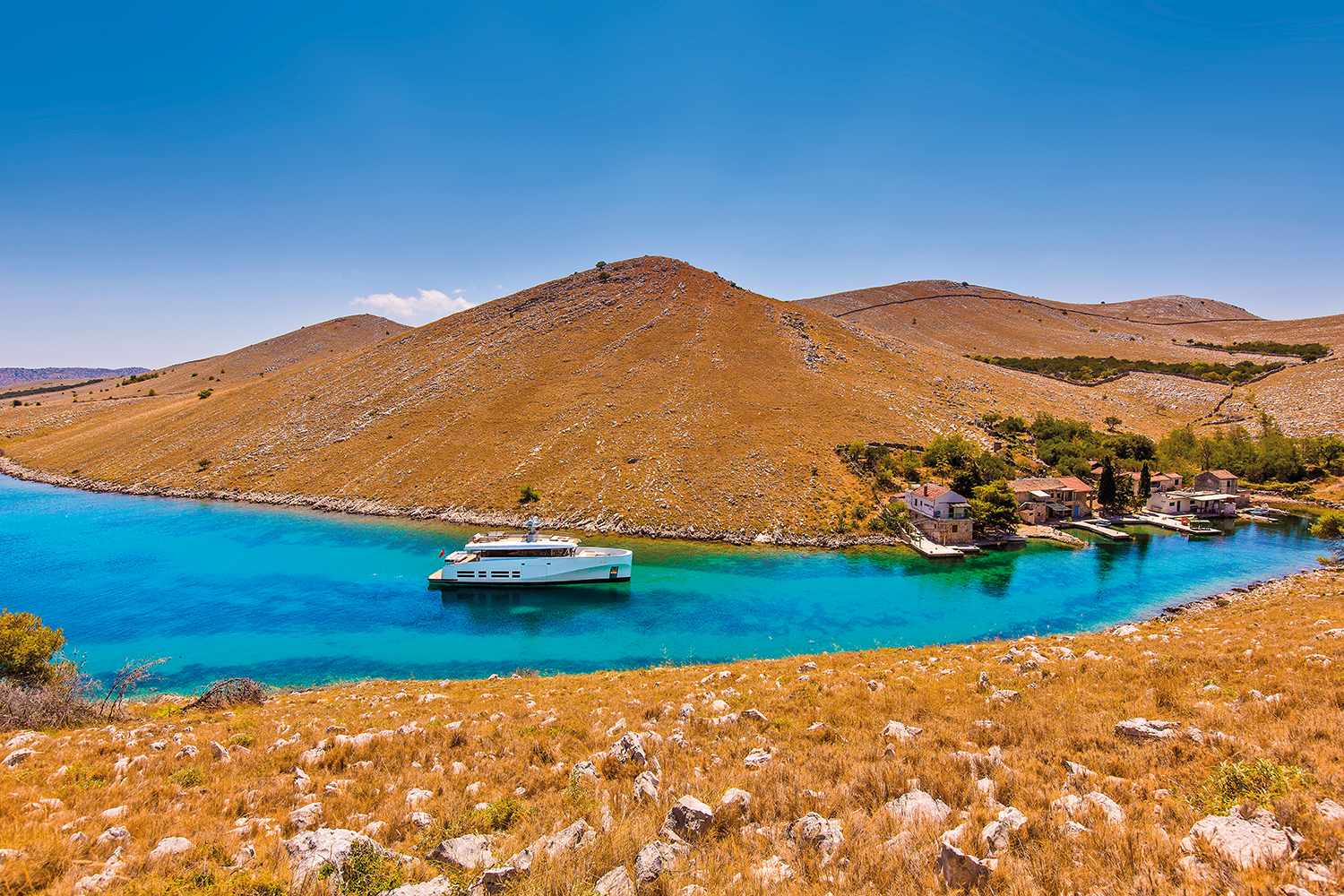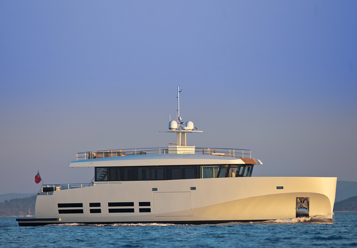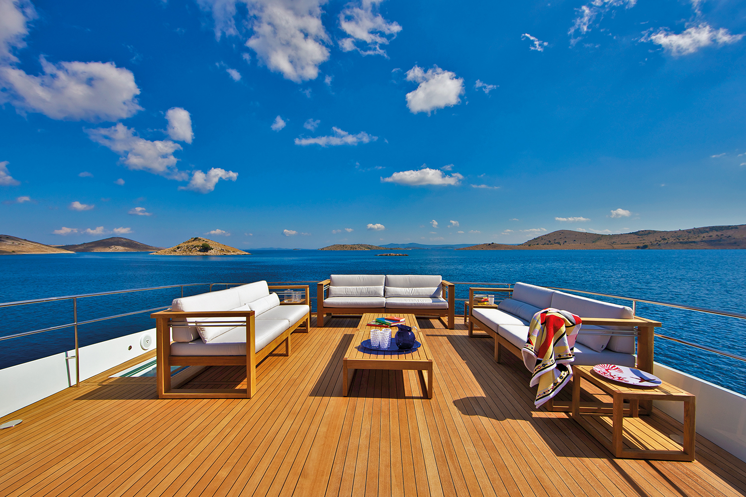 The beauty of this astounding solution means that the cabins astern are flush with the beach platform and just a hair’s width away from  surrounding waters. A fascinating idea when underway (and don’t even think about speeds of 30 knots, exhaust fumes and noise) and more so when at anchor in a bay.