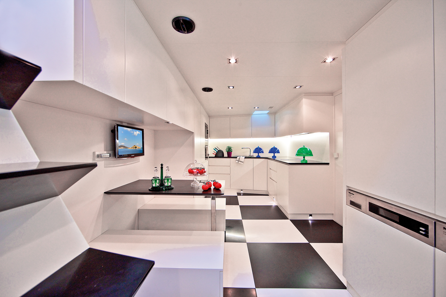 The cabins in the stern take after a pre-adopted layout solution already deployed in Wally sailing yachts where the stern area is reserved for the owner and guests while crew quarters and galley have been situated in the bow.