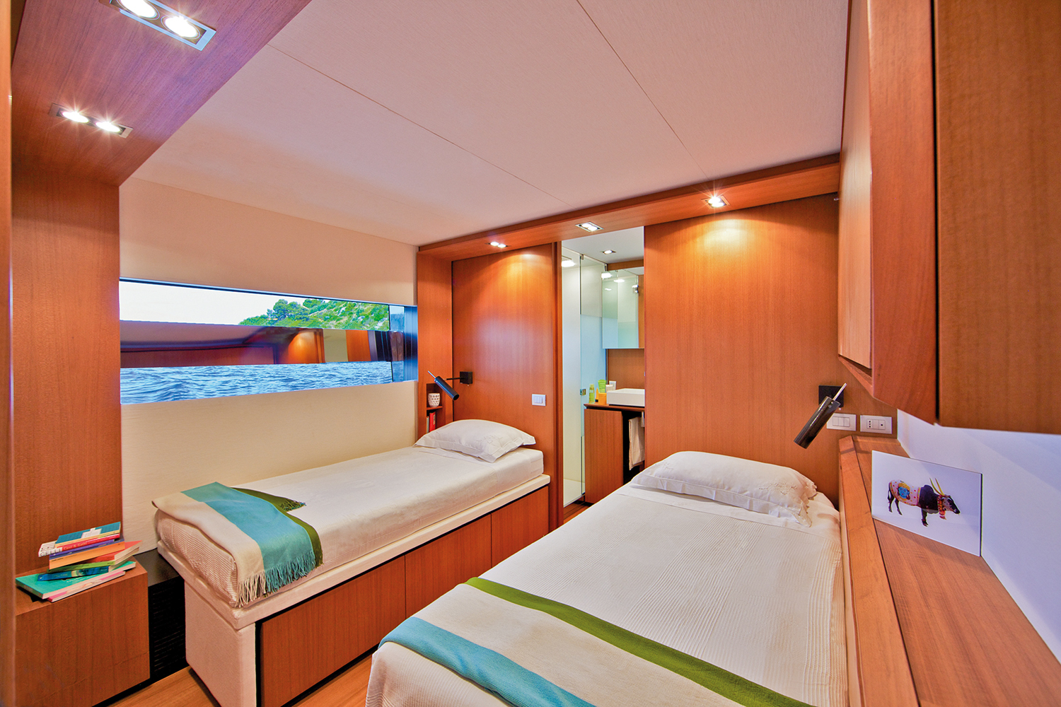 A further two cabins are situated amidships for the yacht’s guests. While they can’t match the same breathtaking stern ocean view as the owner’s suite they are nevertheless bright with plenty of natural light thanks to ample cut glass window panelling along each of the sides.