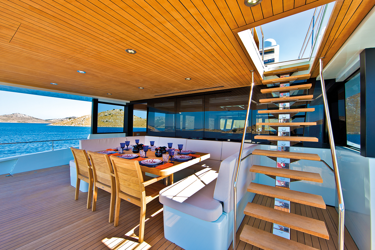 The fly teak lined deck  can be furnished and set up at will according to owner requests. The fact this deck is free of steps and of a second helm /controls station make it highly customizable and potentially versatile.